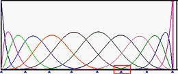 The figures below show the basis functions of degree 5 where the left end and right end knots have multiplicity 6, while all knots in between are simple (Figure (a))). Figure (b) is the result of moving u5 to u6. Those basis functions ended at u6 have fewer knot spans on which they are non-zero. Then, u4 and then u3 are moved to u6, making u6 a knot of multiplicity 4 (Figure (c) and (d). Figure (e) shows the result after moving u2 to u6, creating a knot of multiplicity 5.