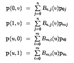 Therefore, as v changes, the expression in the parenthesis defines a Bézier curve with control points pi,0, pi,1, ..., pi,n. These are exactly the control points on row i. Therefore, the v-direction curve runs horizontally and by a similar argument we know that the u-direction curve runs vertically. As examples, boundary curves p(0,v) and p(1,v) are in the v-direction and are defined by row 0 and row n, respectively, and boundary curves p(u,0) and p(u,1) are in the u-direction and are defined by column 0 and column m, respectively.