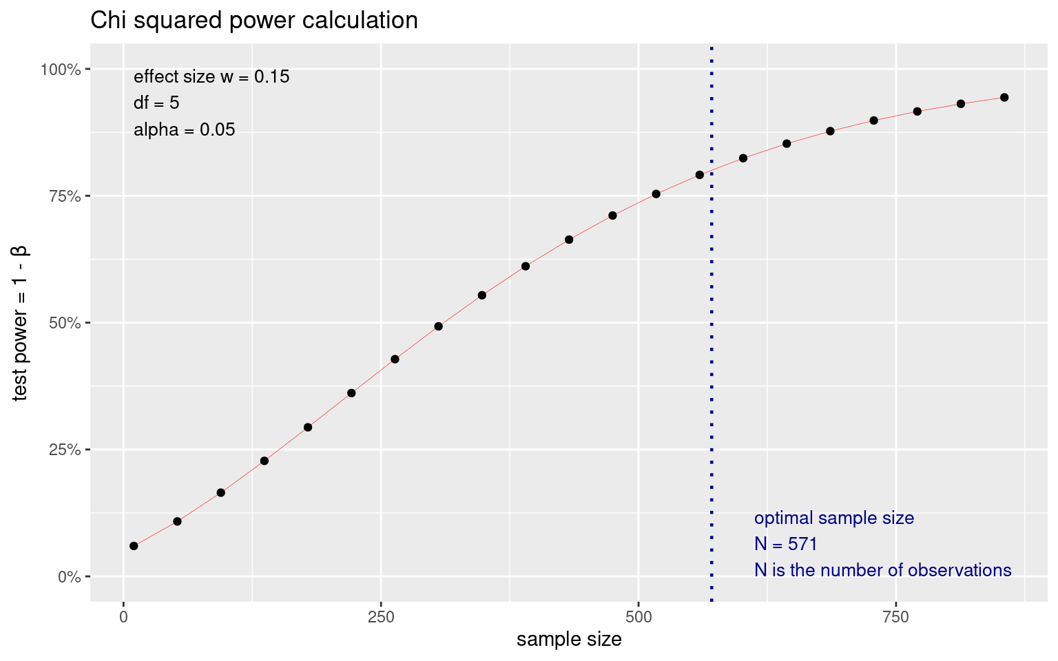 test <- pwr.chisq.test(w = 0.15, df = 5, sig.level = 0.05, power = 0.8)