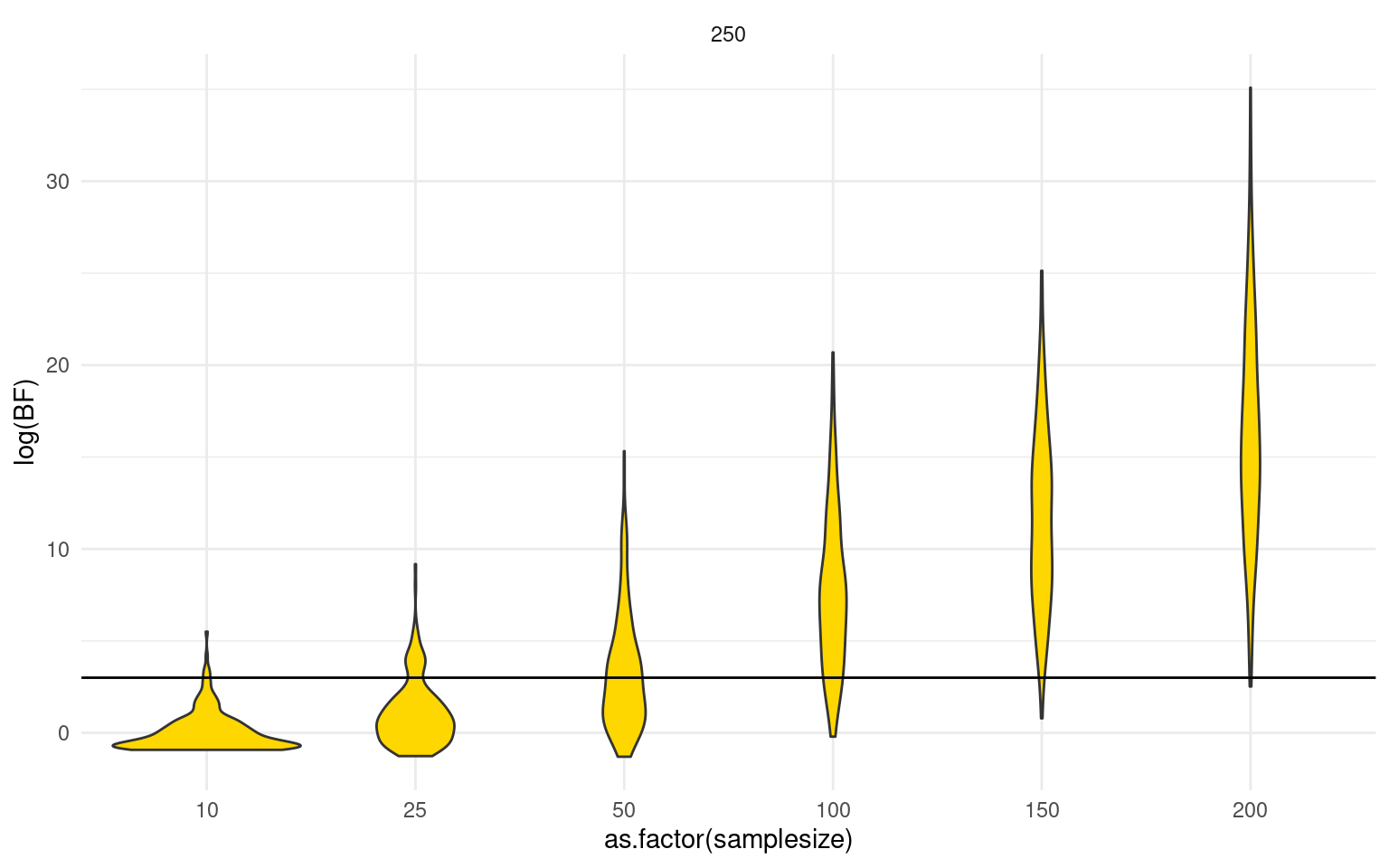 ggplot(data, aes(x = as.factor(samplesize), y = log(BF))) + geom_violin(fill = "gold") +
