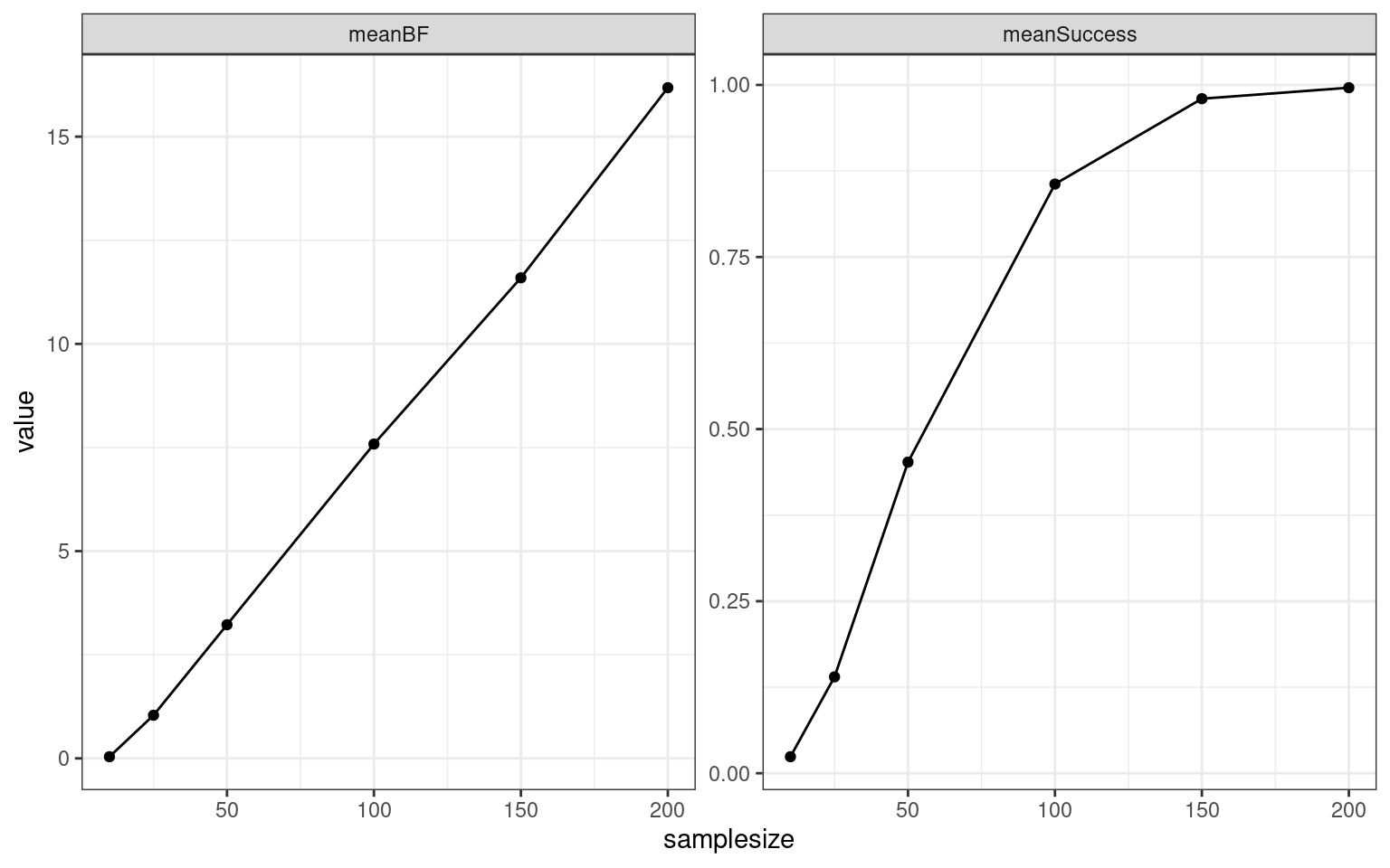 ggplot(aes(x = samplesize, y = value)) + geom_point() + geom_line() + facet_wrap(~name,