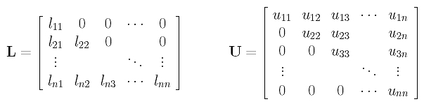 The LU-decomposition method first "decomposes" matrix A into A = L.U, where L and U are lower triangular and upper triangular matrices, respectively. More precisely, if A is a n×n matrix, L and U are also n×n matrices with forms like the following: