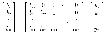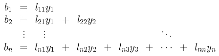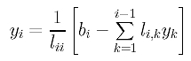 From the above equations, we see that y1 = b1/l11. Once we have y1 available, the second equation yields y2 = (b2-l21y1)/l22. Now we have y1 and y2, from equation 3, we have y3 = (b3 - (l31y1 +l32y2)/l33. Thus, we compute y1 from the first equation and substitute it into the second to compute y2. Once y1 and y2 are available, they are substituted into the third equation to solve for y3. Repeating this process, when we reach equation i, we will have y1, y2, ..., yi-1 available. Then, they are substituted into equation i to solve for yi using the following formula: