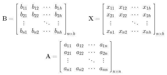 With this in mind, we can solve column j of X using A and column j of B. In this way, the given problem is equivalent to solving h systems of linear equations. Actually, this is not a good strategy either because in solving for column 1 of X matrix A will be destroyed, and, as a result, for each column we need to make a copy of matrix A before running the linear system solver.
