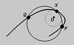 Consider a fixed point f(u) and two moving points P and Q on a parametric curve. These three points determine a plane. As P and Q moves toward f(u), this plane approaches a limiting position. This is the osculating plane at f(u). Obviously, the osculating plane at f(u) contains the tangent line at f(u). It can be shown that the osculating plane is the plane that passes through f(u) and contains both f'(u) and f''(u). More precisely, any point on this plane has an equation as follows, where p and q are parameters: