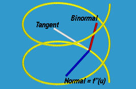 b(u) = (f'(u) × f''(u)) / | (f'(u) × f''(u)) |Thus, the binormal vector b(u) is perpendicular to both f'(u) and f''(u) and hence perpendicular to the osculating plane. The line f(u)+tb(u) is the binormal line at f(u).