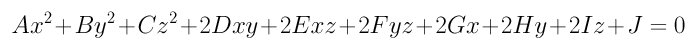It has ten coefficients; but, as mentioned in the discussion of conics, dividing the equation with one of its non-zero coefficients reduces the number of coefficients to nine. Please also note that except for the coefficients for x2, y2 and z2 and the constant term, all coefficients has a multiplier of 2.