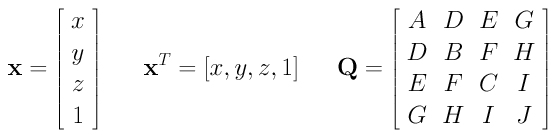 where (x, y, z) is the coordinates of a point. This form translates the general second polynomial of a quadric to the following matrix form: