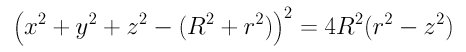 If the rotation axis is the z-axis and the major circle lies on the xy-plane, the equation of the generated torus is the following: