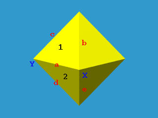 The above figure shows a polyhedron with vertices, edges and faces indicated with upper cases, lower cases and digits, respectively. Let us take a look at edge a = XY. This edge has two incident vertices X and Y, and two incident faces 1 and 2. A face is a polygon surrounded by edges. For example, face 1 has its edges a, c and b, and face 2 has its edges a, e and d. Note that the ordering is clockwise viewed from outside of the solid. If the direction of the edge is from X to Y, faces 1 and 2 are on the right and left side of edge a, respectively. To capture the ordering of edges correctly, we need four more pieces of information. Since edge a is traversed once when traversing face 1 and traversed a second time when traversing face 2, it is used twice in different directions. For example, when traversing the edges of face 1, the predecessor and successor of edge a are edge b and edge c, and when traversing the edges of face 2, the predecessor and successor of edge a are edge d and edge e. Note that although there are four edges incident to vertex X, only three of them are used when finding faces incident to edge a. Therefore, for each edge, the following information are important: