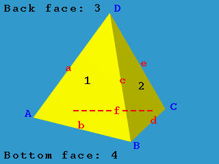 The above is a tetrahedron with four vertices A, B, C and D, six edges a, b, c, d, e and f, and four faces 1, 2, 3 (back) and 4 (bottom). Its edge table is the following. Please use the above diagram to verify this table.