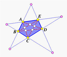 The above shows a pentagon ABCDE. If we draw the five diagonals of this pentagon, we have a smaller pentagon lying in pentagon ABCDE. This smaller pentagon has its vertices in white color. Let us call the original pentagon P and the smaller pentagon in(P), because it is the result of "going" inside of pentagon P.