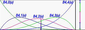 In the left figure above, we have a Bézier curve defined by five control points. Its five basis functions are functions in u as shown in the right figure above. The figures show u=0.5 and all five basis functions. The right-most vertical bar shows the way of partitioning 1 into five intervals and hence the name of partition of unity. Note that the color of a partition is identical to the color used to draw its corresponding basis functions.