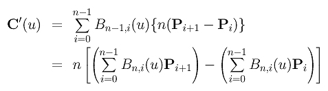 Since the control points are constants and independent of the variable u, computing the derivative curve C'(u) reduces to the computation of the derivatives of Bn,i(u)'s. With some simple algebraic manipulations, we have the following result for B'n,i(u):