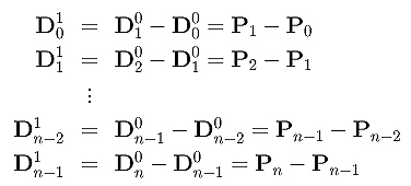 Note that the first level difference has only n points, one less than the number of given control points. More precisely, the first level of difference is the following: