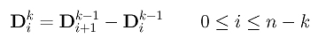 To express higher derivative concisely, we shall use finite difference. Let us define Di0 to be control point Pi for 0 <= i <= n. Then, we define the first level difference Di1 to be the difference of the previous level: