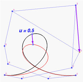 | The corresponding point of u on the new curve is obtained by translating the corresponding point of u on the original curve in the direction of v with a distance of |Bn,k(u)v|. |