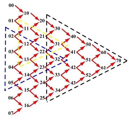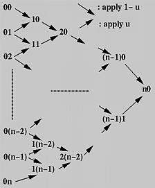 First, all given control points are arranged into a column, which is the left-most one in the figure. For each pair of adjacent control points, draw a south-east bound arrow and a north-east bound arrow, and write down a new point at the intersection of the two adjacent arrows. For example, if the two adjacent points are ij and i(j+1), the new point is (i+1)j. The south-east (resp., north-east) bound arrow means multiplying 1 - u (resp., u) to the point at its tail, ij (resp., i(j+1)), and the new point is the sum.