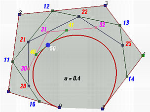 Let us continue with the above figure. Let 20 be the point in the leg of 10 and 11 that divides the line segment 10 and 11 in a ratio of u:1-u. Similarly, choose 21 on the leg of 11 and 12, 22 on the leg of 12 and 13, and 23 on the leg of 13 and 14. This gives a third polyline defined by 20, 21, 22 and 23. This third polyline has 4 points and 3 legs. Keep doing this and we shall obtain a new polyline of three points 30, 31 and 32. From this fourth polyline, we have the fifth one of two points 40 and 41. Do it once more, and we have 50, the point C(0.4) on the curve.