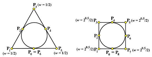 Look at the figure and you will see that control point P2 lies on the circle at its 1/3 length. How do we force a curve to pass through a control point? This is what de Boor's algorithm does. When computing a point corresponding to u on a B-spline/NURBS curve, we insert u multiple times until the multiplicity of u is p, where p is the degree of the curve. The last time when u is inserted, the corresponding point on the curve is actually a (new) control point P2! This observation tells us that if 1/3 has a multiplicity 2, its corresponding point on the curve is a control point. In summary, we can have u3 = u4 = 1/3 and u5 = u6 = 2/3. In other words, to define a full circle using a equilateral, we have knots 0, 0, 0, 1/3, 1/3, 2/3, 2/3, 1, 1, 1! Similarly, to define a full circle with a square, we will need nine control points as shown in the figure, and knots, 0, 0, 0, 1/4, 1/4, 1/2, 1/2, 3/4, 3/4, 1, 1, 1. Based on this discussion, can you define a full circle using a regular polygon of n sides?