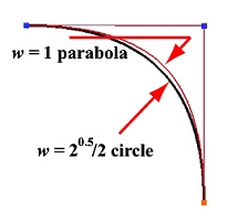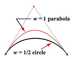 There are two very simple and commonly seen examples. The first is a quarter circle. The angle at P1 is 90 degree and a is 45 degree. Therefore, choosing w = sin(45 degree) = 20.5/2 yields a quarter circle. The figure below shows this quarter circle and the parabola that is defined by the same set of control point with w = 1.