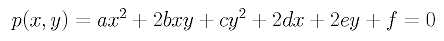 Suppose the resulting conic curve that passes through P0 and P2 and is tangent to P0P1 and P1P2 at P0 and P2, respectively, be represented by an implicit equation of degree 2 as follows, where the six coefficients are unknowns: