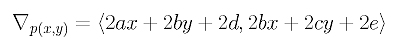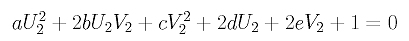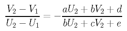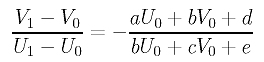 The tangent line and the gradient at a P0 = (U0, V0) are perpendicular to each other. Since the gradient has a slope of (bU0+cV0+e)/ (aU0+bV0+d), the slope of the tangent line at P0 = (U0, V0) is -(aU0+bV0+d)/ (bU0+cV0+e). Since P0P1 is tangent to the conic at P0 and since the slope of line P0P1 is (V1 - V0)/(U1 - U0), these two slope values must be equal to each other. Therefore, the following must hold: