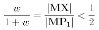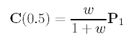 Since C(0.5) and X are the same point, X and control point P1 are on the same line through the coordinate origin M, and the length of the vector X is w/(1+w) times of the length of vector P1. In other words, we have |MX|/|MP1| = w/(1+w).