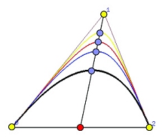 A very natural addition would be one more point. Plugging the coordinates of this point into the equation will give us an equation that is similar to those for control points P0 and P2. But, where is this point? This point should be inside of the triangle of the three control points so that the convex hull property can be maintained. The position of this point should also be "regular" so that we can easily change this point to produce another conic curve. One way to do this is allowing this point to be on the line segment joining P1 and the mid-point of P0P2. In this way, moving the fifth point on this line segment generates different conic curves as shown below: