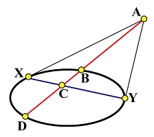 When is this rational Bézier curve an ellipse or a hyperbola? The answer comes from a theorem in projective geometry. From a point A outside of a given conic curve draw two tangents meeting the curve at X and Y, and an arbitrary secant line that meets the chord XY at C and the conic at B and D with B being inside of the triangle AXY as shown in the figures below. Note that if the curve is an ellipse, the order of these points is A, B, C and D; however, if it is a hyperbola, point D lies on the other branch of the curve!