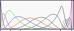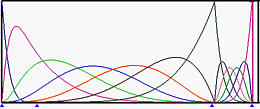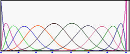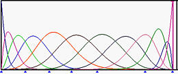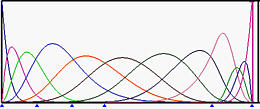 The above shows the basis functions of degree 5 where the left end and right end knots have multiplicity 6, while all middle knots are simple (left on top row). The top right figure is the result of moving u5 to u6. Those basis functions ended at u6 have fewer knot spans on which they are non-zero. In the middle row figures, u4 and then u3 are moved to u6, making u6 a knot of multiplicity 4. The bottom row figure shows the result after moving u2 to u6, creating a knot of multiplicity 5.