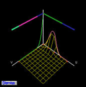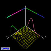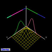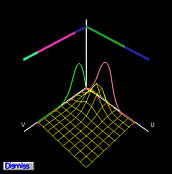 The two-dimensional basis functions are shown as wireframe surfaces. Since