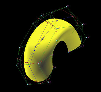 The following figure shows an example. This B-spline surface is defined by 5×5 control points and knot vector (in both directions) { 0, 0, 0, 0, 0.5, 1, 1, 1, 1 }. Thus, the degree in both directions is 3.