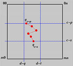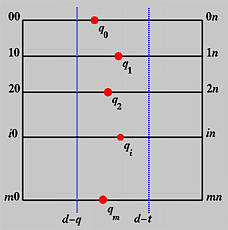 Therefore, qi(v) is a point corresponding to v on the B-spline curve defined by the control points of row i. If v is in knot span [vd,vd+1), then only q+1 control points on row i are involved in the computation of qi(v), where q is the degree of Nj,q(v). These control points are pi,d, pi,d-1, ..., pi,d-q, if v is not equal to vd. Otherwise, if v is equal to vd, a knot of multiplicity t, then the involved control points are pi,d-t, pi,d-t-1, ..., pi,d-q. Therefore, using the control points from column d-q to column d-t, where t is zero if v is not a knot, we can apply de Boor's algorithm to each row to obtain m+1 new points q0(v), q1(v), ..., qm(v). This is shown in the following diagram.