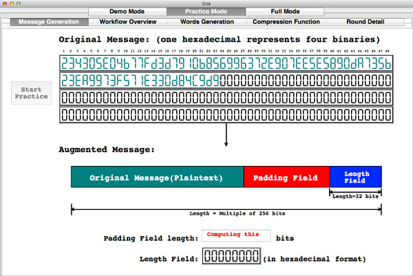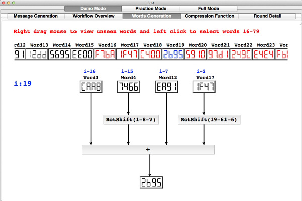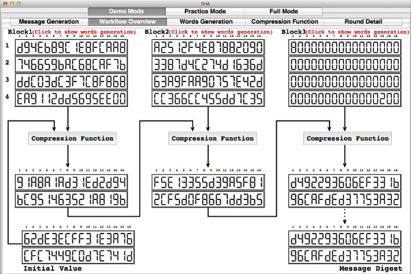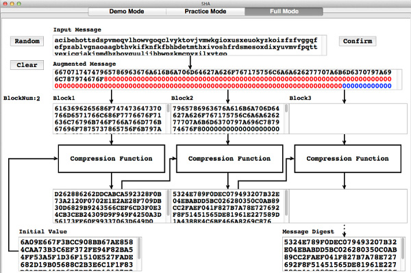 SHAvisual is designed to help students learn and instructors teach an advanced SHA algorithm, SHA-512. It has Windows, MacOS and Linux versions.