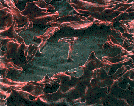 The original image was at a magnification of 900x and was taken using Polaroid Type 55 4 in. x 5 in. BW film. From this an 11 in. x 17 in. print was made and hand painted. The colored image was then reduced to 8.5 in. x 11 in. using a Canon color copier and then scanned at 300 dpi on an Apple Color Scanner.
