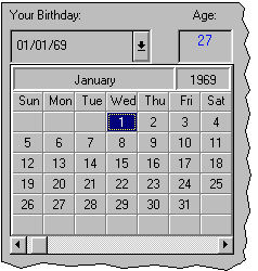 In Classified, a shareware diary program, the user cannot directly type the date of birth, but must use the calendar object, which appears after clicking on the drop-down arrow. The only way to change the year is to use the scroll arrows at the bottom: one click for each month, 12 clicks to the year. Now my birthday isn't too far off from the default date shown, but even then, it required 112 mouse-clicks to set it (could the developer be related to the manager of the SSN project above?). Some users might be tempted to use the thumbnail in the scroll bar to advance the rate more rapidly, and it does: because the program accepts dates in the range from the year 1800 to the year 9999, each pixel movement of the thumbnail changes the date by 51 years. Since birthdates cannot be in the future, and there probably aren't too many computer users born in the year 1800, the range of acceptable values could probably be reduced without excluding too many people. |