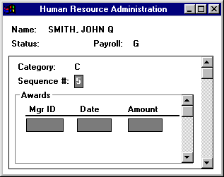 Scrollbars in PeopleSoft applications are used as database navigation controls. In the illustration, clicking on the outer scrollbar would display the next category of awards, and clicking on the inner scroll bar would display the next award in the current category. Keep in mind, the frames do not scroll up and down; the information in each is simply replaced. PeopleSoft often nests scrollbars 3 or 4 deep, such that the user becomes absolutely dumbfounded not only as to how the information is arranged, but also as to how to navigate within a window. |