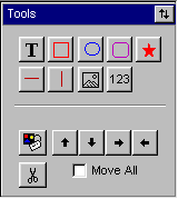 The toolbox in Visual Labels is much more difficult to get the hang of. First, forget the operating characteristics of every other toolbox you have used. Then, click the mouse button and hold it, dragging the mouse to the drawing area, being careful to keep the button pressed while moving the mouse. This can be unnerving, especially to users familiar with any other drawing tool. One of the principles that makes GUI easy to learn is that interface features are consistent across applications. Changing an established standard can only lead to confusion. |