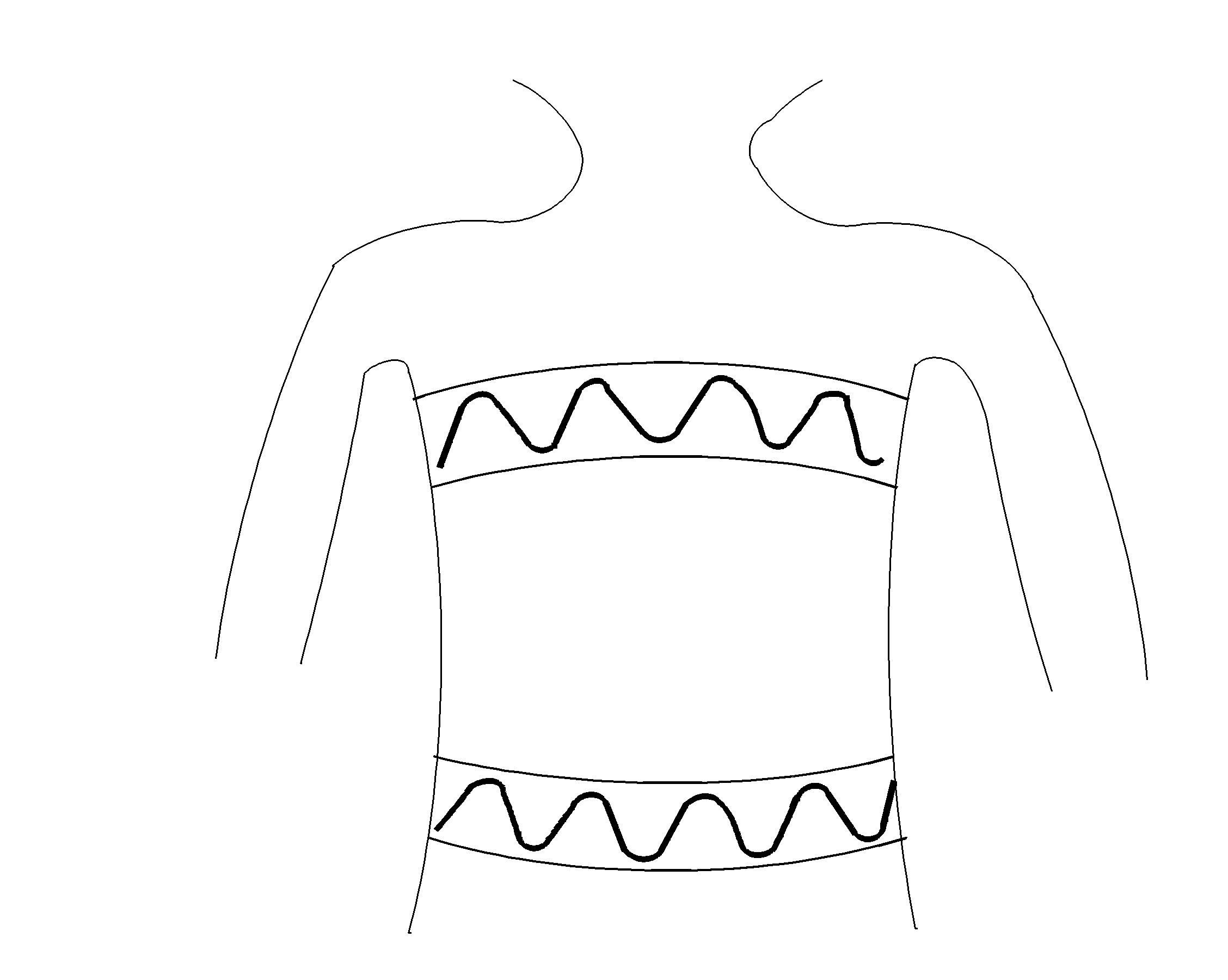 In inductance plethysmography, subject wears two elastic bands, one around the chest, other around the abdominal area as shown in Figure 3 below. A conductor in each one of these elastic bands form an inductor. An oscillator sends sinusoidal signals to the inductor and measures the changes in the cross sectional area of the inductor. Using this information, one can deduce the area enclosed by the inductor, hence the thoracic and abdominal cross sectional area.