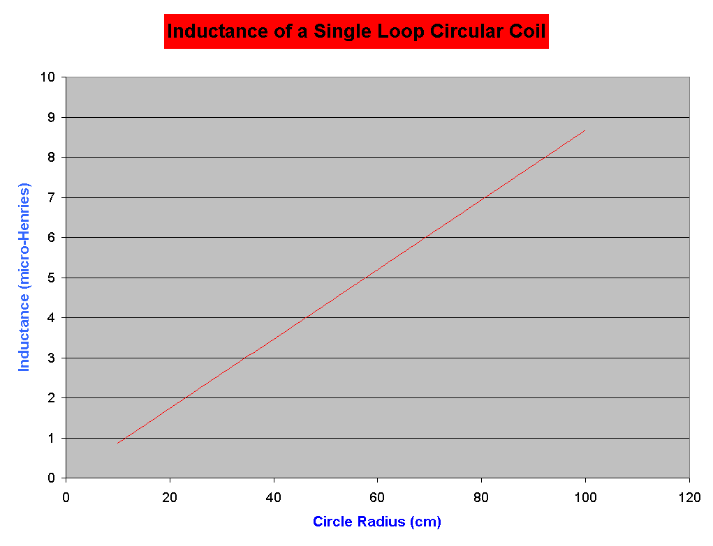 One can integrate equation 5 along the wire loop forming the coil to find B(t), which can be plugged into the equation 4 to determine the voltage. Finally the inductance can be found using the equation 3. Even for a simple shape like a circle, the above equations are difficult to calculate. Engineers usually utilize numerical techniques to calculate such integrals. Figure 4 below shows the results from numerical evaluation of inductor values as a function of the radius of the circular loop. As it can be seen from the figure below, inductance increases linearly with the radius, or by the square root of the area of the circle.
