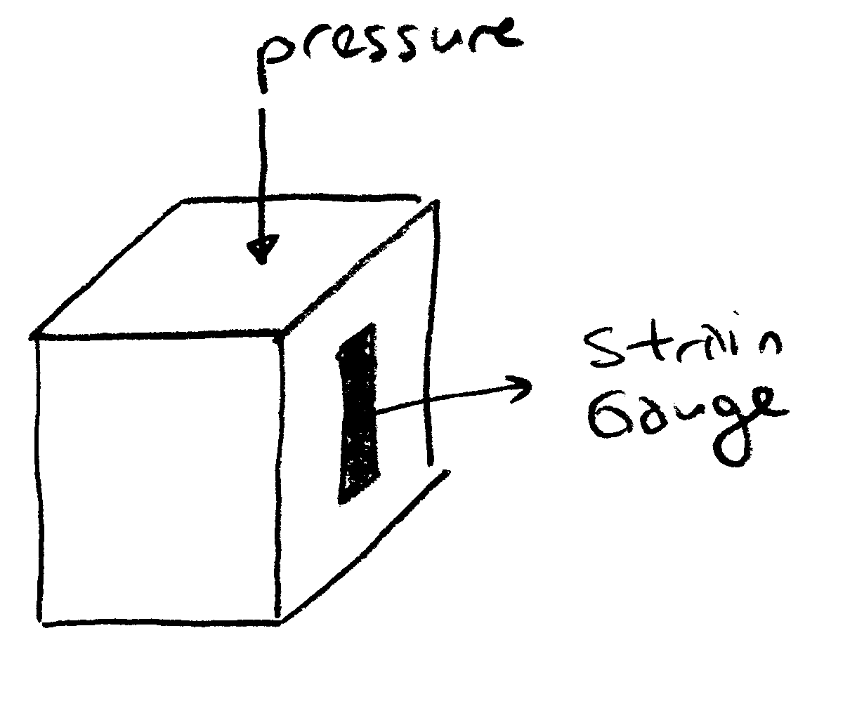 We would like to build a pressure sensor using a block of elastic material where the pressure is applied to the top surface measured by a strain gauge mounted on one of the side walls of the block. We would like to obtain a D R/R value of 0.01% on the strain gauge when a 1 mm Hg of pressure is applied on the top surface. If the gauge factor of the strain gauge is 2.5, what should the Young's Modulus of Elasticity, E, for the elastic block should be?