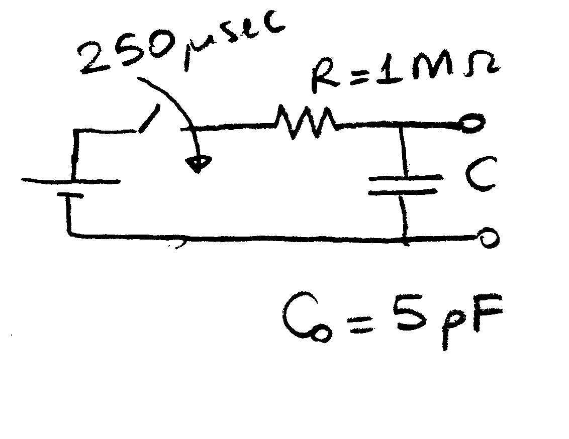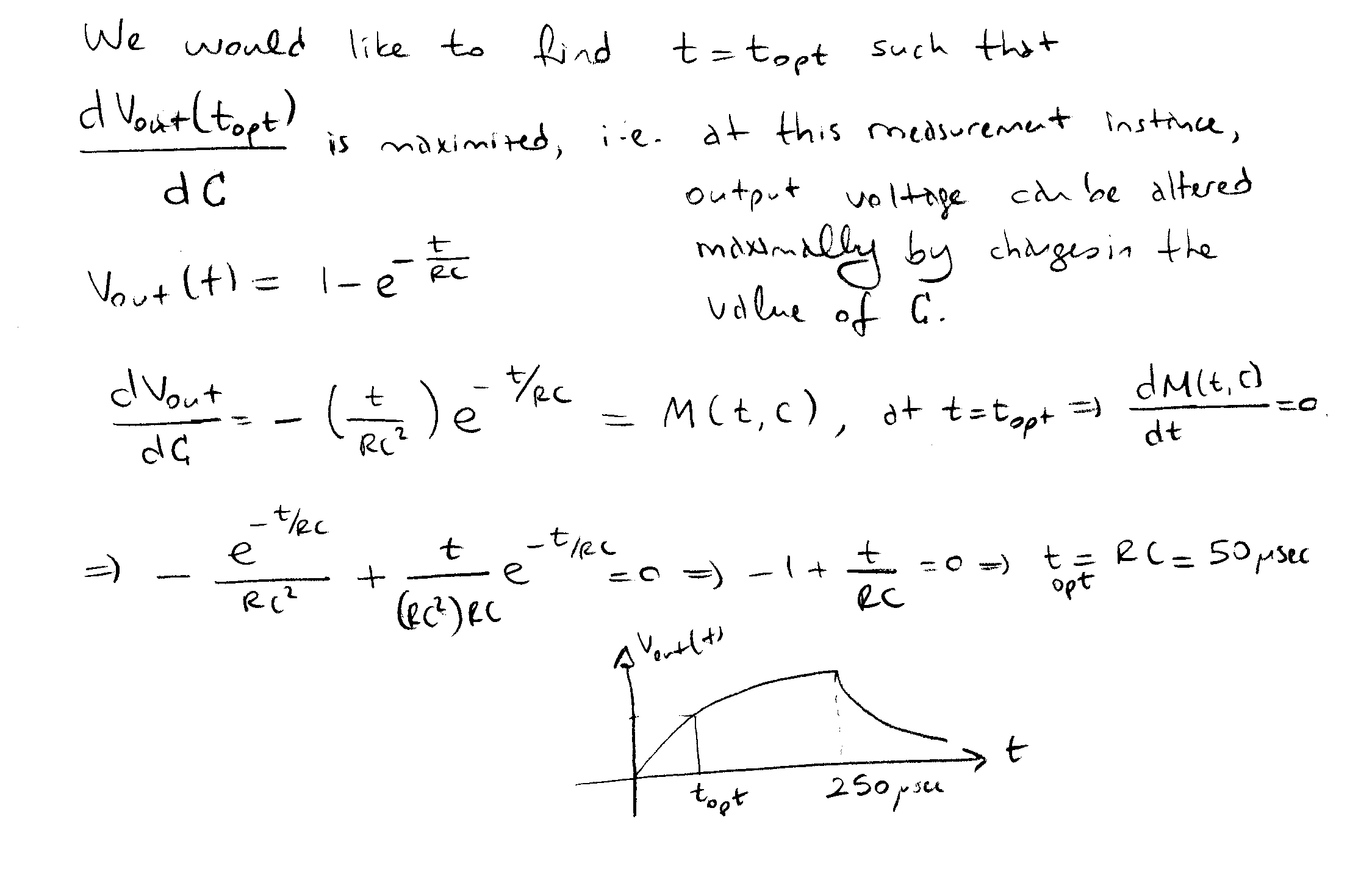 We have built a capacitive pressure sensor, which has a capacitance of 5 pF when no pressure is applied. We are periodically charging it with a 10 MW resistor connected to a 1 Volt source for 250 m -seconds. Calculate the best time to sample the output voltage (voltage across the capacitor) during the charging period to determine the value of the capacitor.