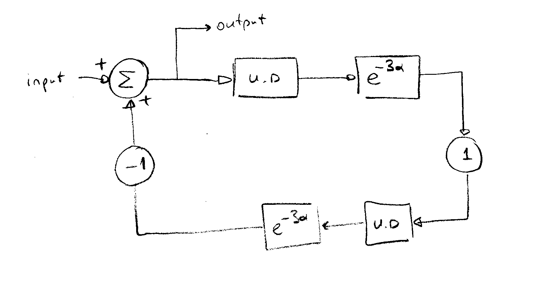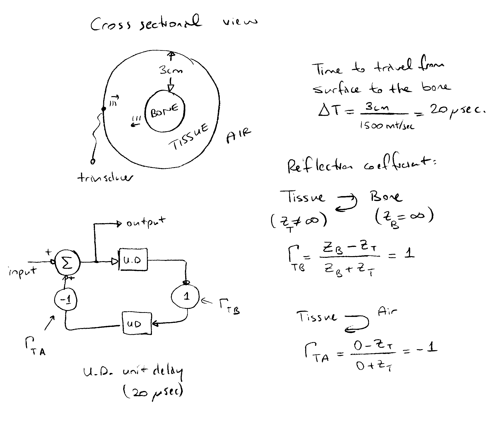A short burst of ultrasound is travelling in a 3 cm thick tissue surrounding a bone. Speed of the sound in the tissue is given as 1,500 meters / second. A transducer is attached to the skin and it is small enough to not to effecting the sound characteristics of the tissue. Furthermore, we will assume that the transducer is perfectly coupled to the tissue. This transducer is being used to produce and detect sounds at every 20 m -seconds. Assuming that the sound impedance of the air is zero, and the sound impedance of the bone is infinite, determine the discrete model of the system. (Note: you can assume that the sound travels through the tissue with no loss)