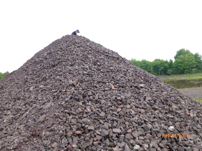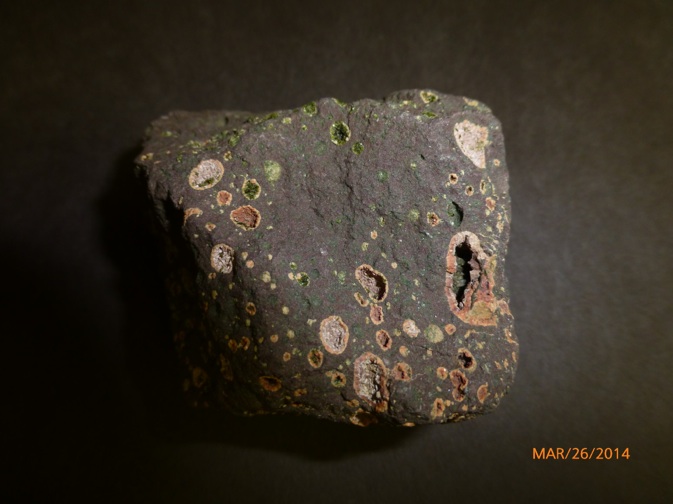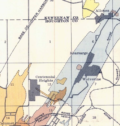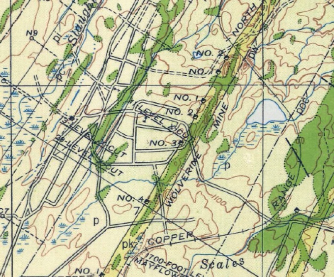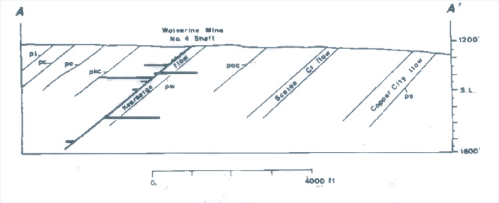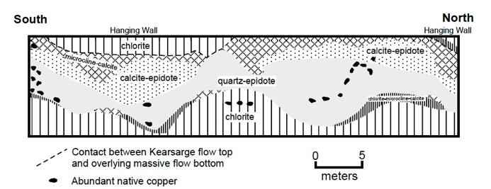 The Wolverine Mine dump gives access to the flow top amygdaloid of the Kearsarge Flow, one of the large lava units of the PLV, and a productive 10 m thick amygdaloidal top which hosted at least seven other successful mines. The flow has been traced for 55 km along strike. Its top is fragmental with a cellular vesicular amygdaloid below, grading into a plagioclase porphyritic basalt and finally to an aphyric trap.