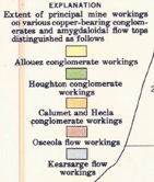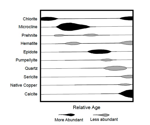 A paragenetic diagram based on observations of many specimens of amygdaloid, where the vesicle coating sequences of minerals were observed. At Wolverine the chlorite was the earliest mineral and it is always outside of the others, while calcite was the latest, and is always inside. This figure comes from Stoiber and Davidson (1959), who made such observations on many Keweenaw mine dumps.