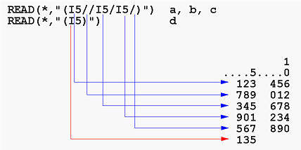 a is read in using I5 from the first five positions of the first line. Thus, it receives 123. After this, we see a /, which terminates the use of the first input line and jumps to the second. Then, we see another /, which terminates the use of the second input line and jumps to the third. Now, we have I5 for variable b. Therefore, b receives 345 from the third input line. After reading b, we have a / and c will use the fourth input line. Hence, c receives 901. But, immediately after this I5, there is another / and as a result this fourth line is also skipped. Thus, we are on the fifth line. Then, we reach the end of the format and there is no variables remains. Thus, the first READ completes. Note that after the first READ completes, five lives have been read.INTEGER :: a, b, c, d READ(*,"(I5//I5/I5/)") a, b, c READ(*,"(I5)") d