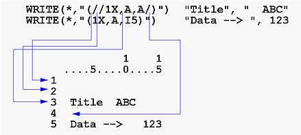 When the first WRITE starts, format scan begins with the first /. This terminates the first output line. Then, we see a second / which terminates the second line. Thus, we have two blank lines. The next edit descriptor is 1X, which moves to position 2 of the third output line. Now, we see A, which requires a data value. Therefore, "Title" is printed in positions 2 to 6 on the third line:WRITE(*,"(//1X,A,A/)") "Title", " ABC" WRITE(*,"(1X,A,I5)") "Data --> ", 123