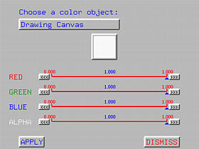To change the color of any one of these objects, select that object from the pull-down menu, followed by changing each of the color components and their alpha channel value using the four sliders. The color corresponding to the current setting will be shown in the small square. If you are satisfied with a particular color, clicking on APPLY will apply the selected color to that object on the drawing canvas. Please note that the color you see on the drawing canvas may be slightly different from the color shown in the color square since objects on the canvas are illuminated with light sources.