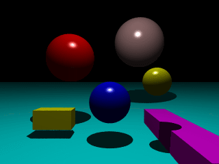 If you take a look at the read and pink spheres, their bottom parts seem disappearing in the dark. The blue and yellow spheres look a little better; but, they still look strange. Usually, adding some ambient would improve the situation. The following scene is exactly identical to the above one, except that all spheres now carry ambient values of 0.2: